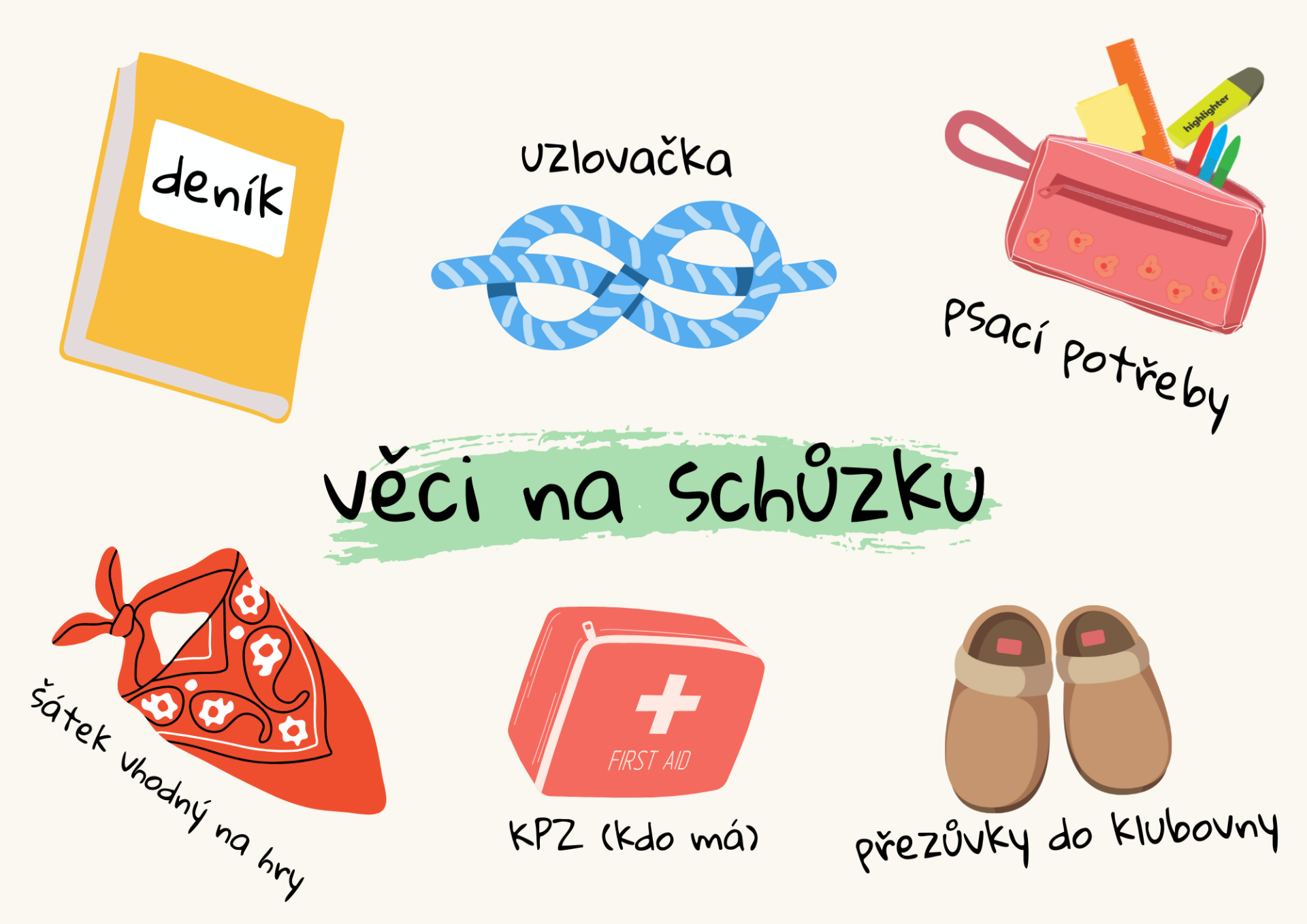 potřeby, šátek, KPZ, uzlovačka), přezůvky (kdo je již na klubovně nemá),