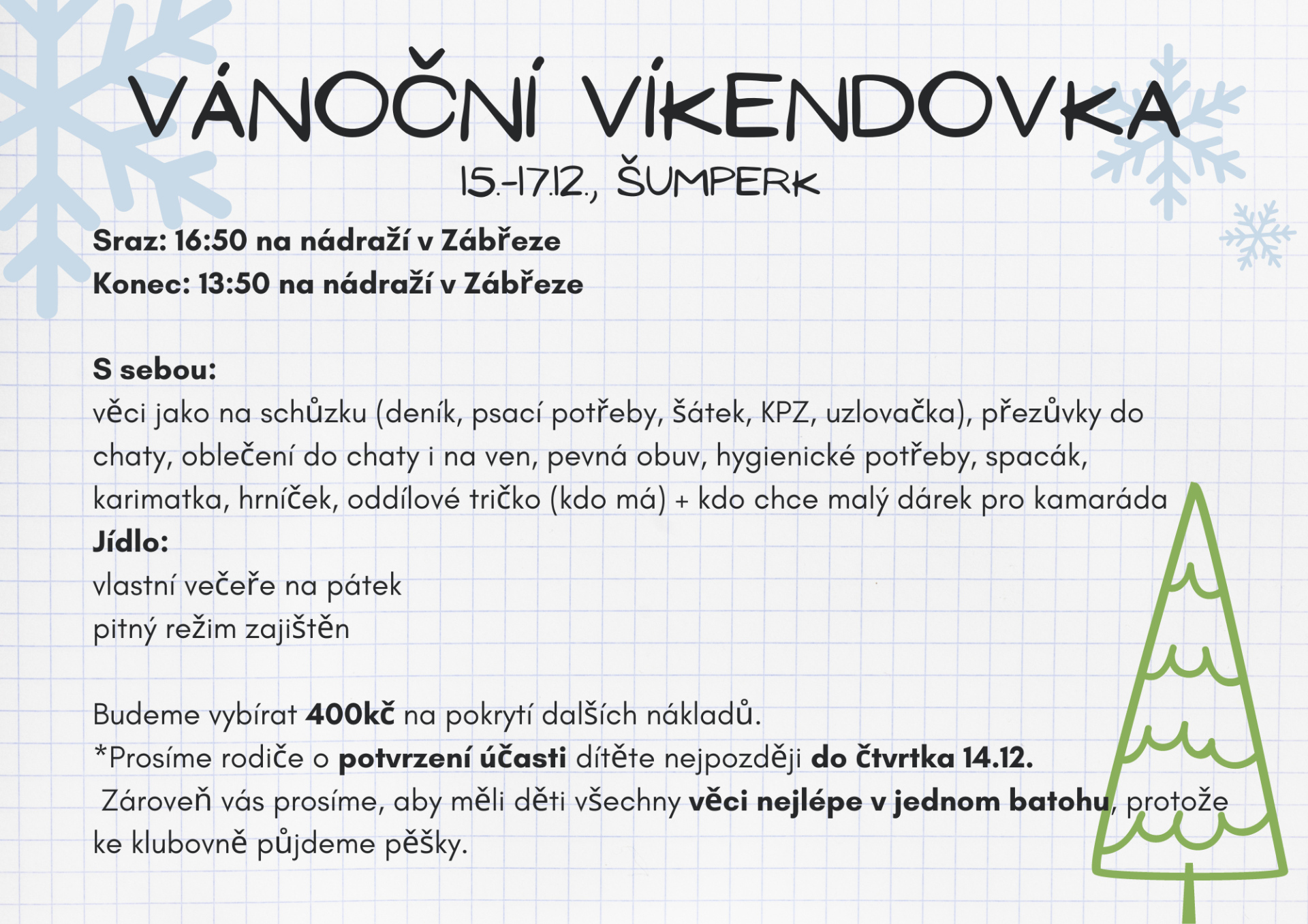 Budeme vybírat 400kč na pokrytí dalších nákladů. (doprava, klubovna, jídlo…)
